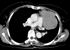 病历摘要:女,56岁。因胸部不适,2月来诊,无发热,无咯血。起病以来体重明显减轻。查体:左胸呼吸音减弱,左上胸扣诊浊音。胸部X线片示“左上肺占位病变”。做胸部CT线检查。
