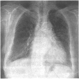 女性,46岁。呼吸困难入院,胸部X线平片如下图,右侧肋膈角区垂直于胸壁内侧面的线状影为